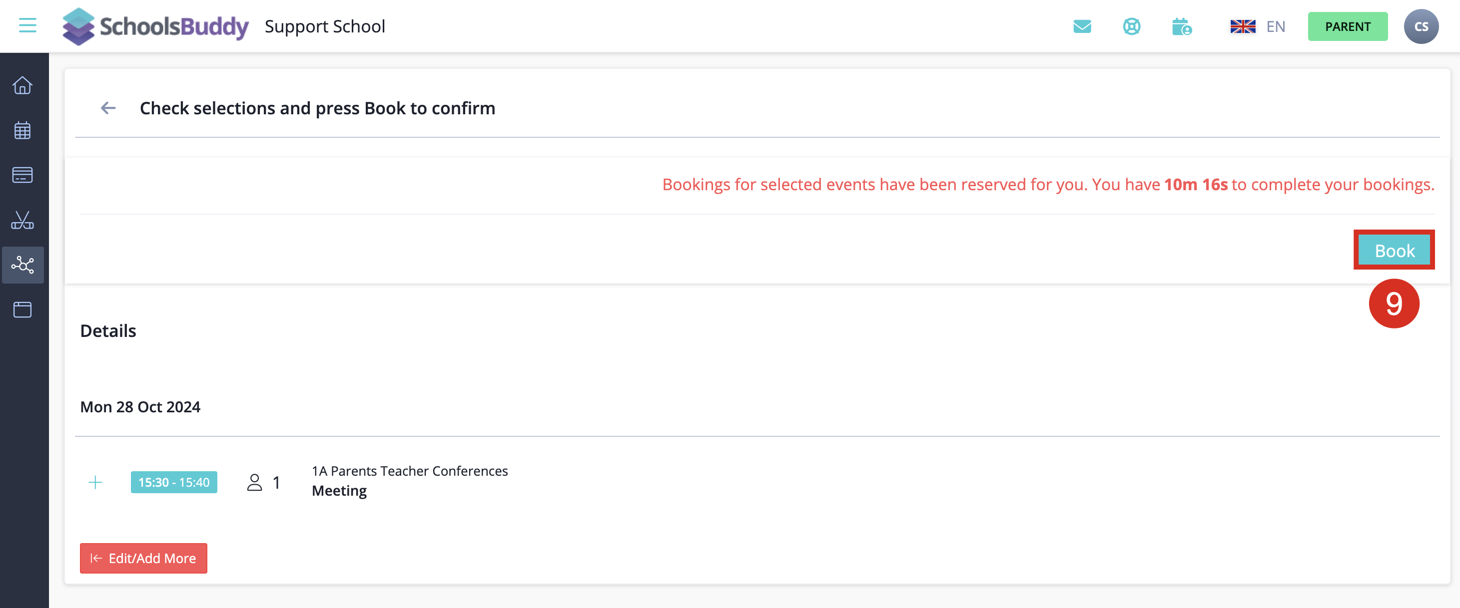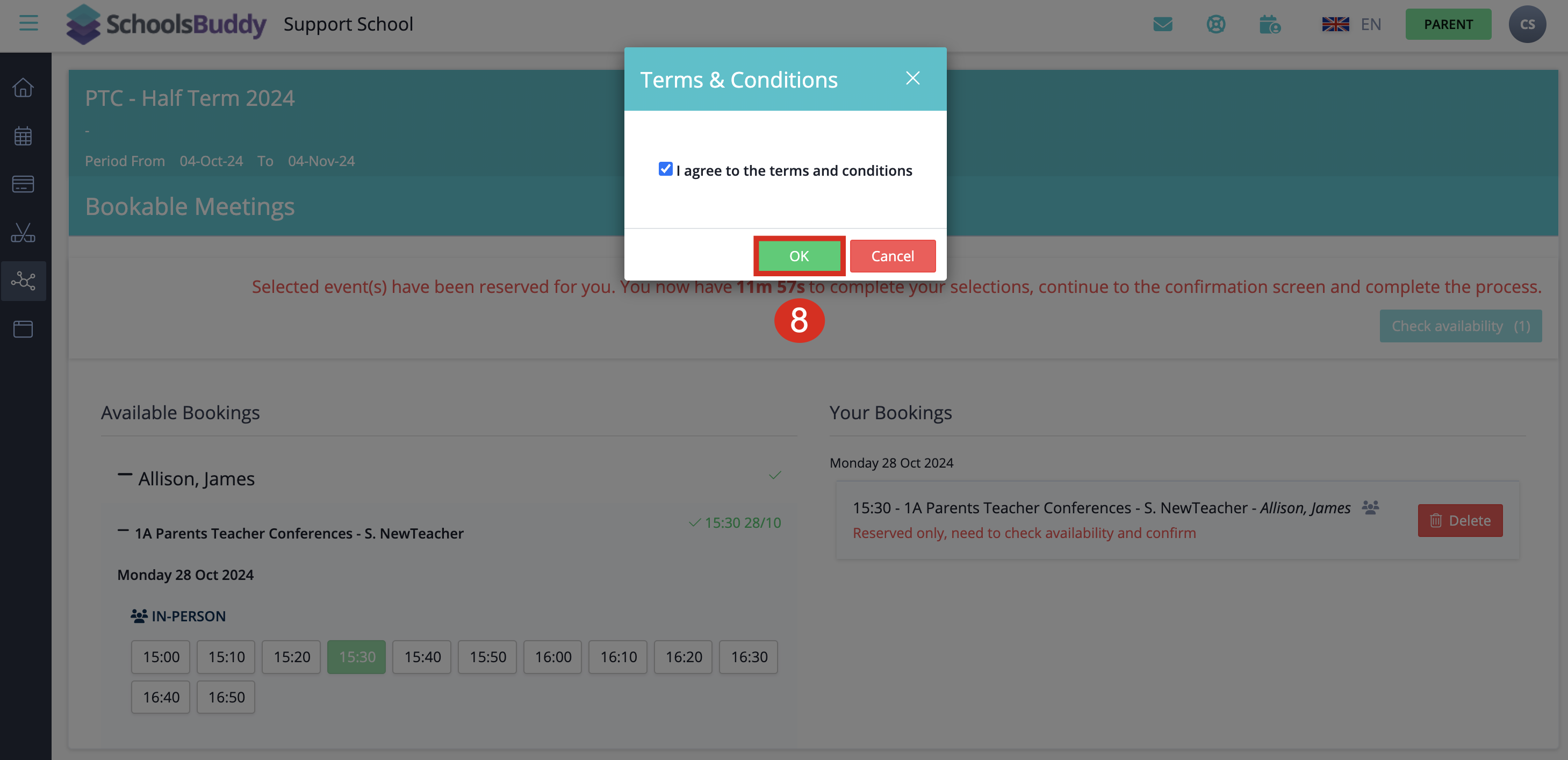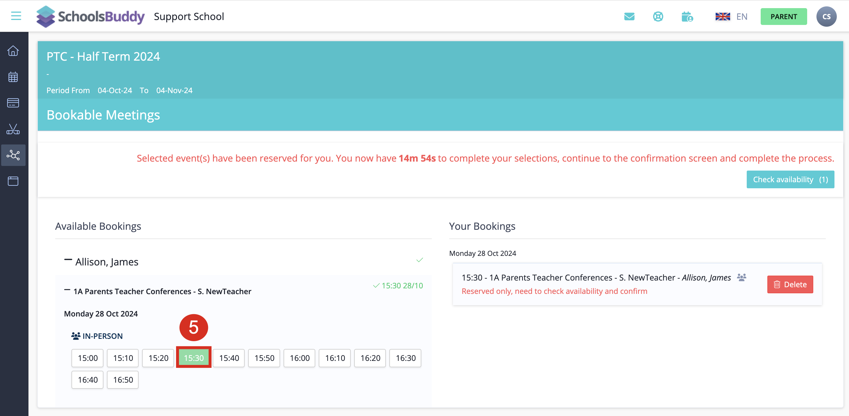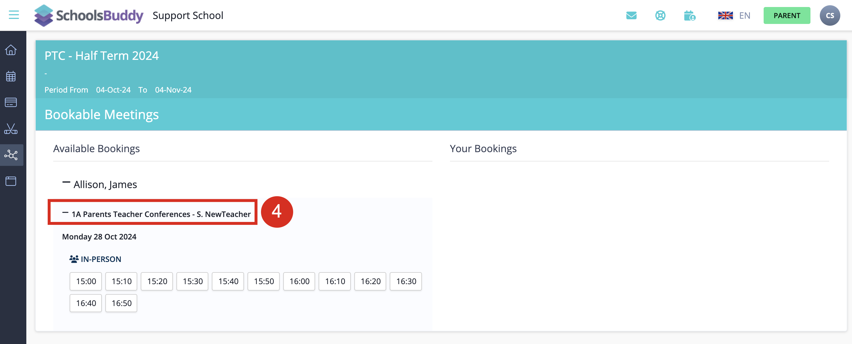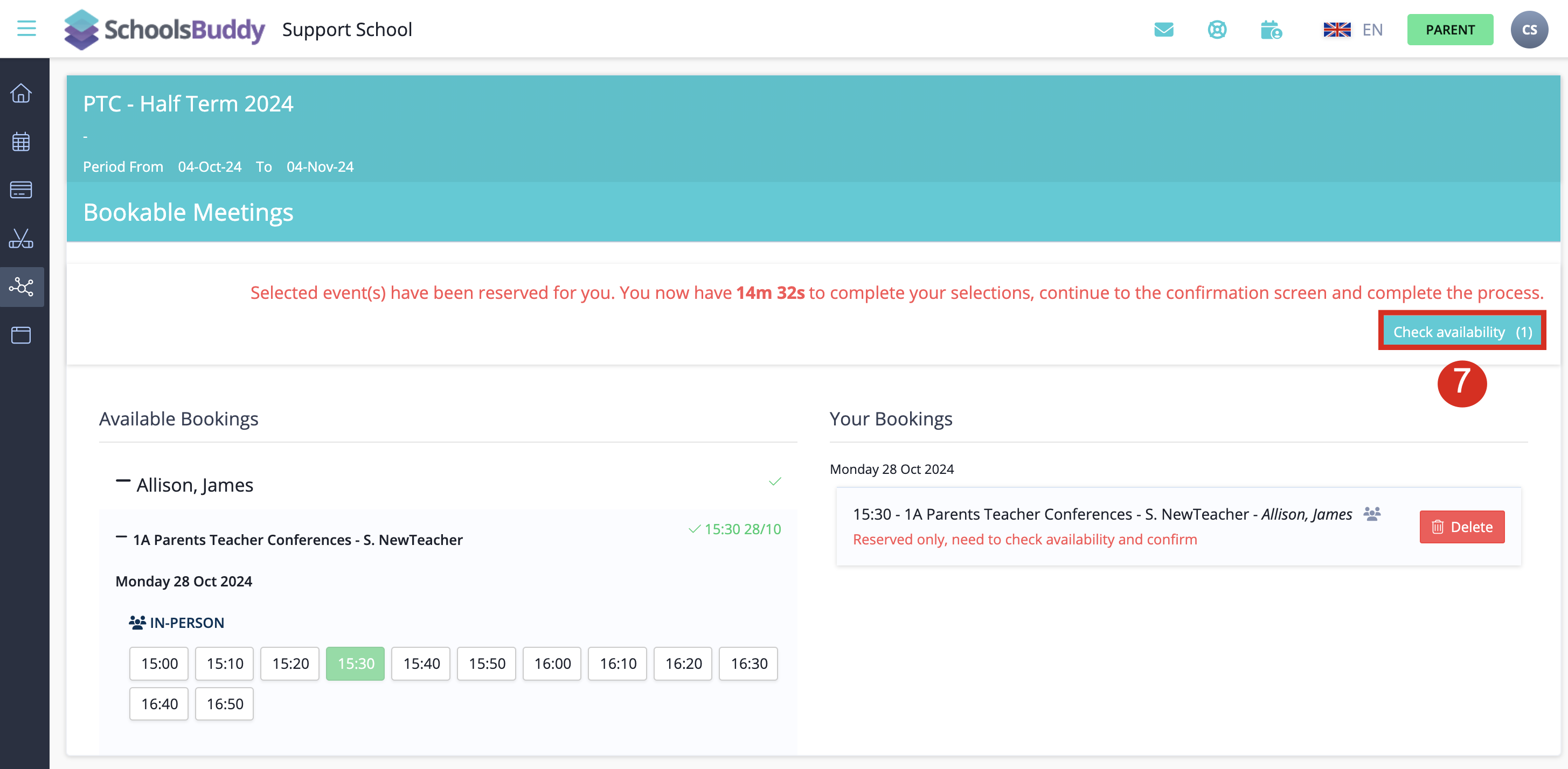 To book a time slot, select the time slot desired. When you book a time slot for one subject/teacher the same time slot will be blocked out for all the other parents so no double bookings can be made. Once you select a booking, it will appear on the right side of the screen.