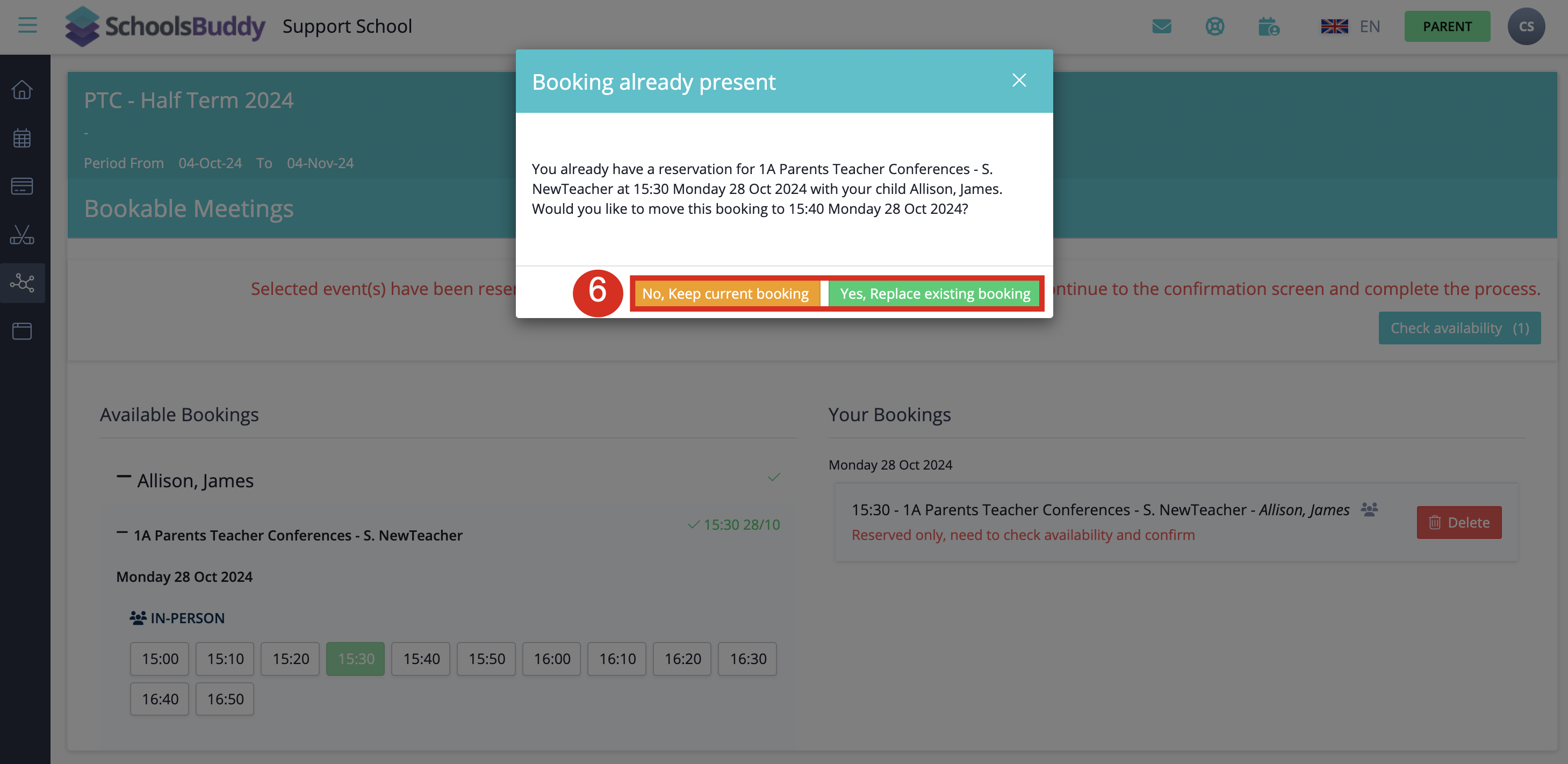 If you want to change the time slot you have chosen, click on another time slot and you will see a warning message appear: